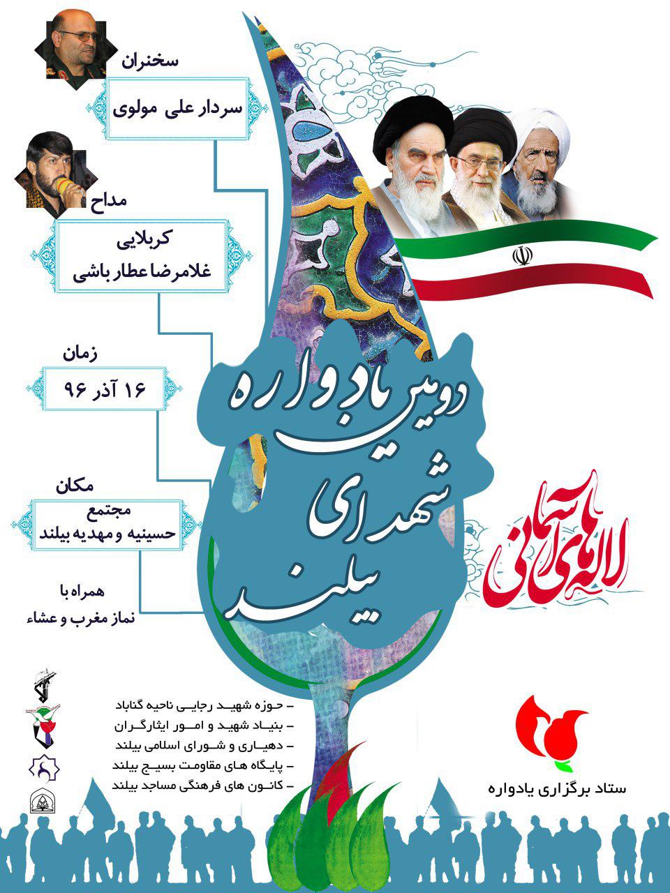 دومین یادواره شهدا ی بیلند | سخنران: سردار مولوی | مکان: مهدیه بیلند | زمان: پنجشنبه ۹۶.۹.۱۶ ساعت ۱۶ با غبار روبی مزار شهدا و حرکت جمعی به سمت مهدیه